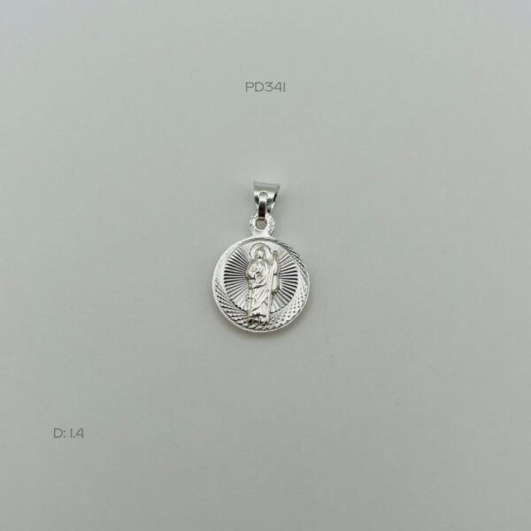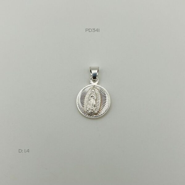 Dije de plata italiana de medalla diamantada de la Virgen de Guadalupe y San Judas Tadeo. Medidas: 1.4cm de diámetro. Peso promedio: 2.1gr. Plata ley .925