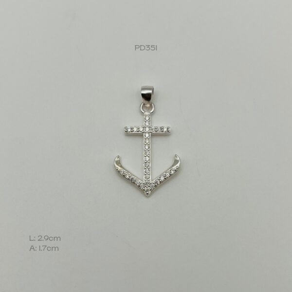 Dije de plata italiana con diseño de ancla con incrustación completa de zirconia. Medidas: 2.9cm de largo y 1.7cm de ancho. Peso promedio: 1.9gr. Plata ley .925