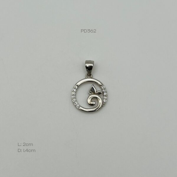 Dije de plata italiana rodizada con diseño de una ramita con una mariposa, enmarcada en un círculo, con incrustación de zirconia mini en los costados. Medidas: 2cm de largo y 1.4cm de diámetro. Peso promedio: 1.4gr. Plata ley .925
