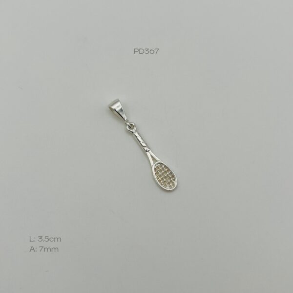 Dije de plata nacional con diseño de raqueta. Medidas: 3.5cm de largo y 7mm de ancho. Peso promedio: 1.4gr. Plata ley .925
