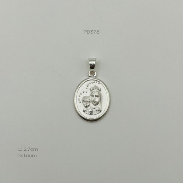 Dije plata italiana de medalla de la Virgen del Carmen. Medidas: 2.7cm de largo y 1.6cm de diámetro. Peso promedio: 3.5gr. Plata ley .925