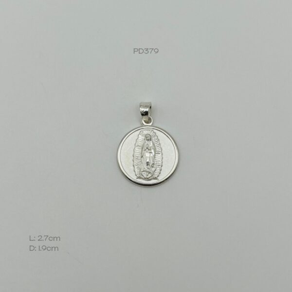 Dije plata italiana de medalla de la Virgen de Guadalupe. Medidas: 2.7cm de largo y 1.9cm de diámetro. Peso promedio: 4.2gr. Plata ley .925