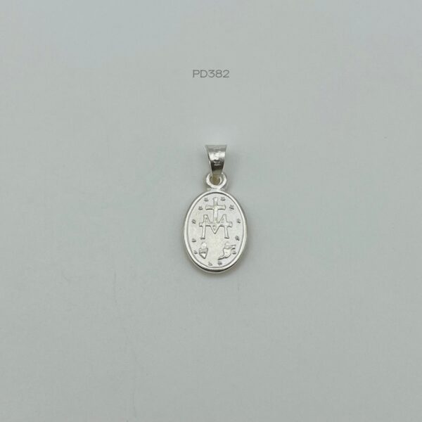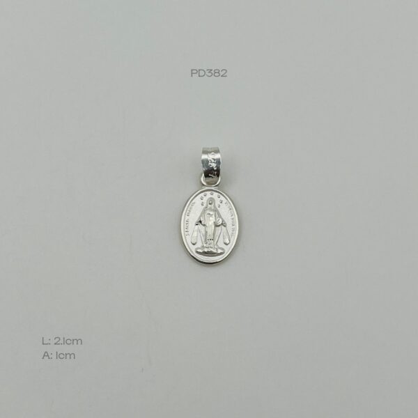 Dije plata italiana de medalla de la Virgen María. Medidas: 2.1cm de largo y 1cm de ancho. Peso promedio: 1.7gr. Plata ley .925