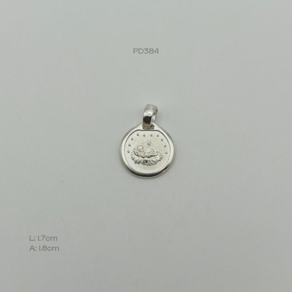 Dije plata italiana de medalla de bautizo. Medidas: 1.7cm de largo y 1.8cm de ancho. Peso promedio: 1.6gr. Plata ley .925
