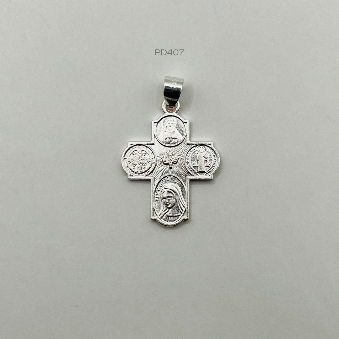 Dije de plata italiana con diseño de cruz de 4 vías con diferentes medallas de San Benito, Vírgen María, El Sangrado Corazón y El Espiritu Santo al centro. Medidas: 2.6cm de largo y 1.7cm de ancho. Peso promedio: 1.9gr. Plata Ley .925