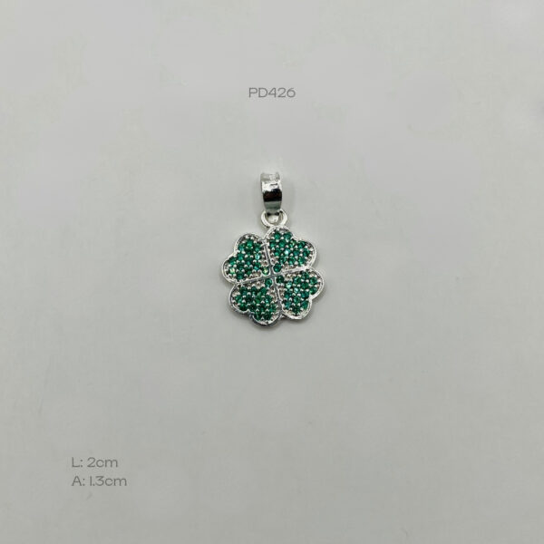 Dije de plata mexicana con diseño de trébol con incrustación de zirconia verde. Medidas: 2cm de largo y 1.3cm de ancho. Peso promedio: 1.1gr. Plata Ley .925