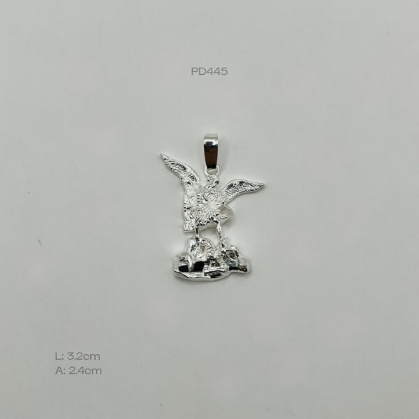 Dije de plata italiana con diseño de San Miguel Arcángel. Medidas: 3.2cm de largo y 2.4cm de ancho. Peso promedio: 3.6gr. Plata Ley .925