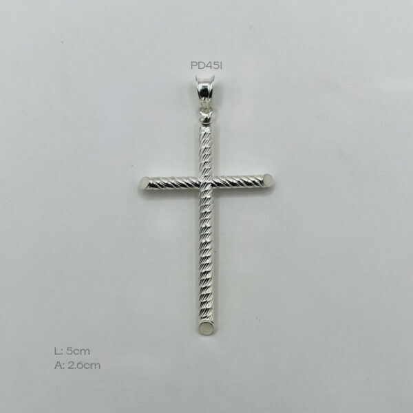 Dije de plata italiana con diseño de cruz con acabado diamantado. Medidas: 5cm de largo y 2.6cm de ancho. Peso promedio: 1.8gr. Plata Ley .925
