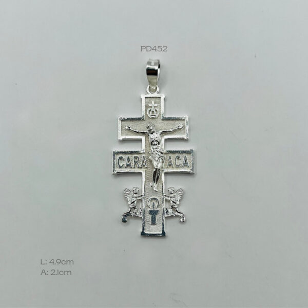Dije de plata mexicana con diseño de cruz de caravaca. Medidas: 4.9cm de largo y 2.1cm de ancho. Peso promedio: 4.8gr. Plata Ley .925