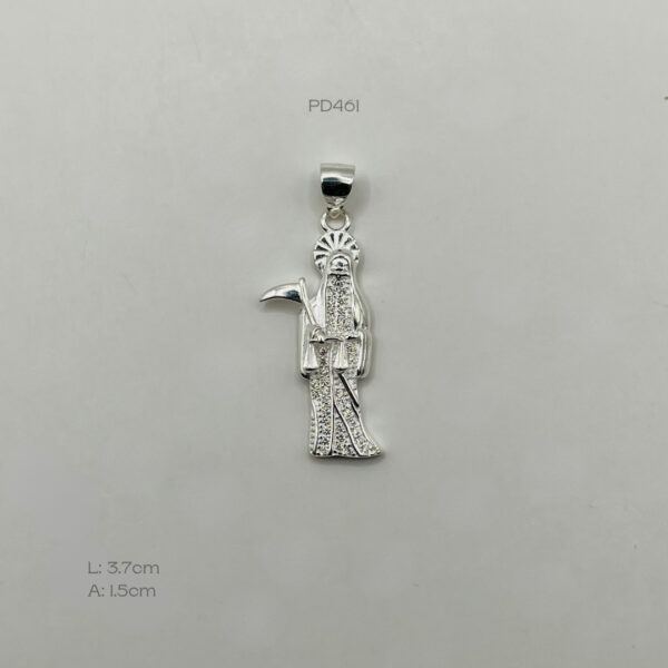 Dije de plata mexicana con diseño de la santa muerte. Medidas: 3.7cm de largo y 1.5cm de ancho. Peso promedio: 3.2gr. Plata Ley .925