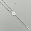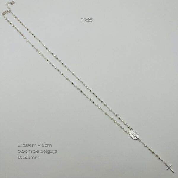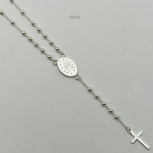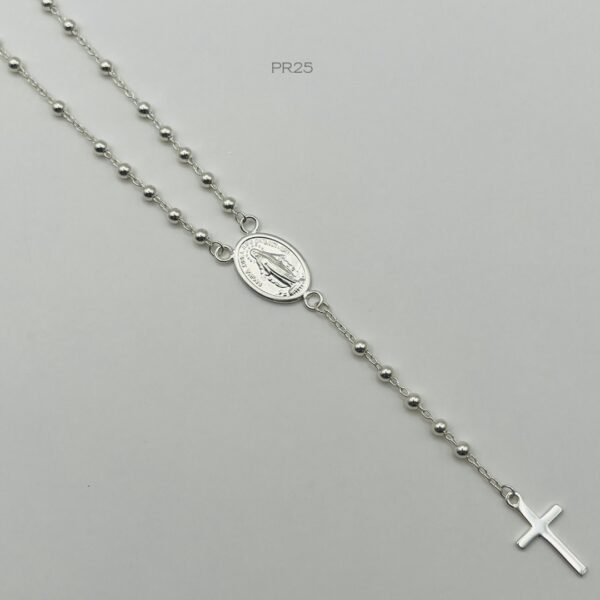 Rosario de plata italiana, con diseño de medalla de la Virgen Milagrosa y cruz. Medidas: 50cm en cuello y 3cm de extensible, 5.5cm de colguije restante y 2.5mm de diametro en bola. Peso promedio: 6gr.
