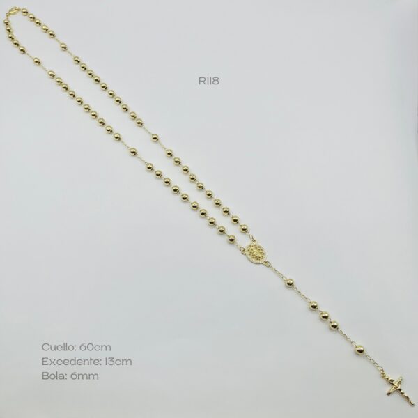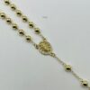 Rosario dorado de imagen de Virgen de Guadalupe y contorno con incrustación de zirconia mini y crucifijo. Medidas: 60cm en cuello y 13cm de exedente, con bola de 6mm. Oro laminado 18k.