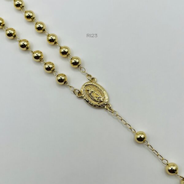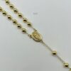 Rosario dorado de imagen de la Virgen de Guadalupe y crucifijo. Medidas: 60cm en cuello y 13cm de exedente, con bola de 6mm. Oro laminado 18k.
