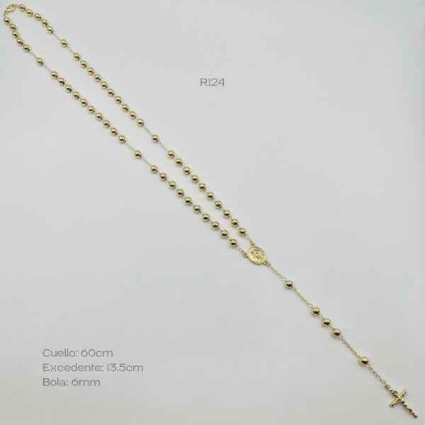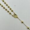 Rosario dorado de imagen de la Vírgen Milagrosa y crucifijo. Medidas: 60cm en cuello y 13.5cm de exedente, con bola de 6mm. Oro laminado 18k.