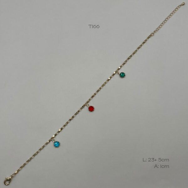 Tobillera dorada con diseño de barra irregulares y tres zirconias de color; azul, rojo y verde. Medidas: 23cm de largo + 5cm de extensible y 1cm de ancho. Oro Laminado 18k.