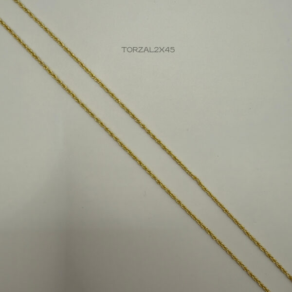 Cadena de tejido torzal clásico con medida de 2mm de ancho y 45cm de largo + 4cm de extensible. Oro Laminado 18k.