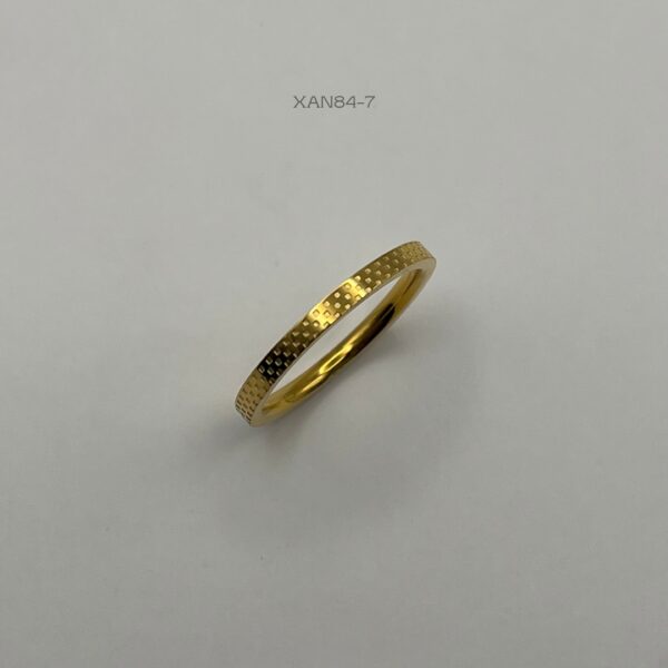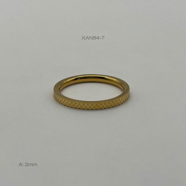 Anillo de acero inoxidable en color dorado, con diseño de cuadros. Medida: 2mm de ancho, #7. Acero Inoxidable.