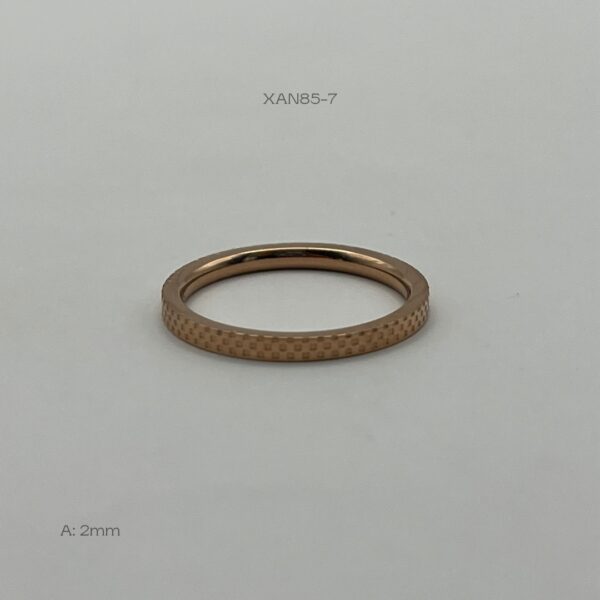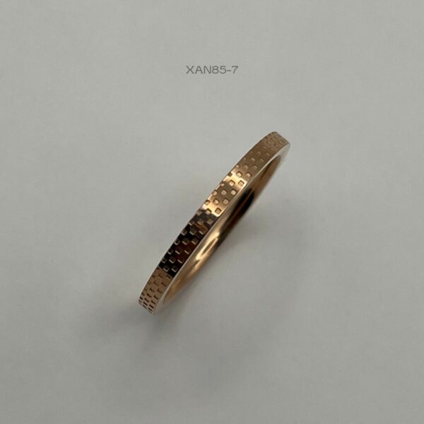 Anillo de acero inoxidable en color rose gold, con diseño de cuadros. Medida: 2mm de ancho, #7. Acero Inoxidable.