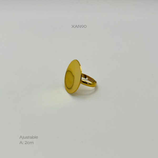 Anillo de acero inoxidable ajustable en color dorado, con una placa redonda lisa. Medidas: 2cm de ancho. Acero Inoxidable.