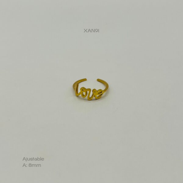 Anillo de acero inoxidable ajustable en color dorado, con diseño de la palabra «LOVE». Medidas: 8mm de ancho. Acero Inoxidable.