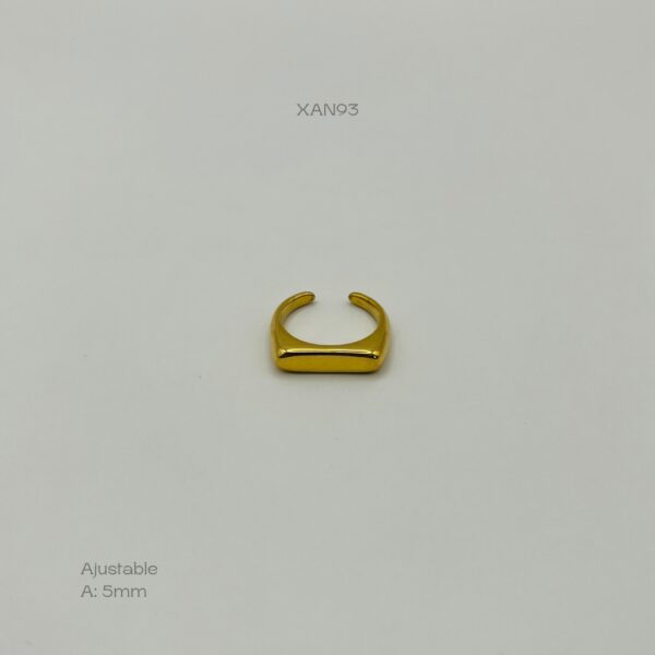 Anillo de acero inoxidable ajustable en color dorado, con diseño cuadrado liso. Medidas: 5mm de ancho. Acero Inoxidable.