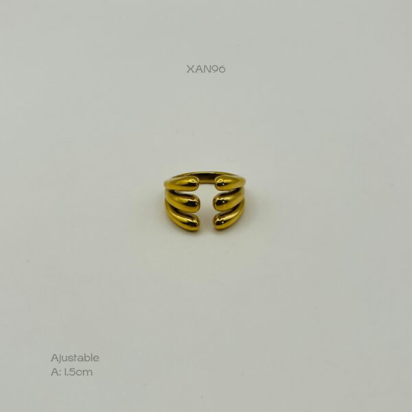 Anillo de acero inoxidable ajustable en color dorado, con diseño grueso de tres líneas gruesas. Medidas: 1.5cm de ancho. Acero Inoxidable.