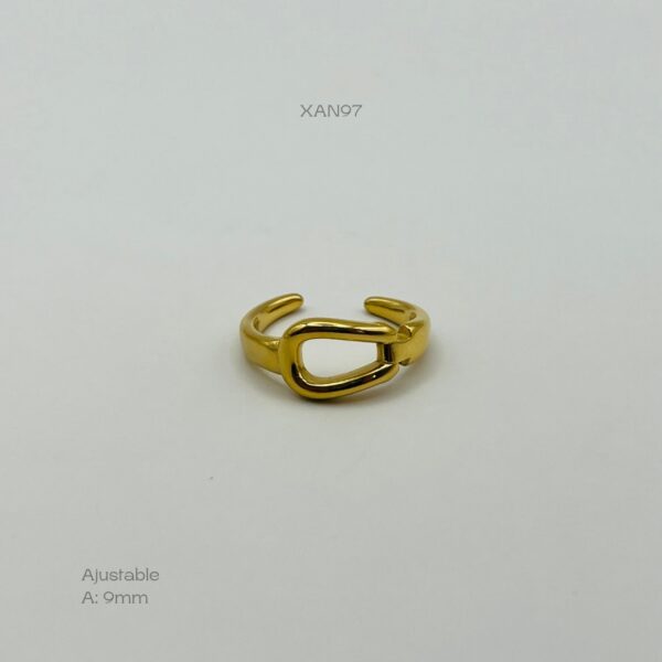 Anillo de acero inoxidable ajustable en color dorado, con diseño de simulación de hebilla. Medidas: 9mm de ancho. Acero Inoxidable.